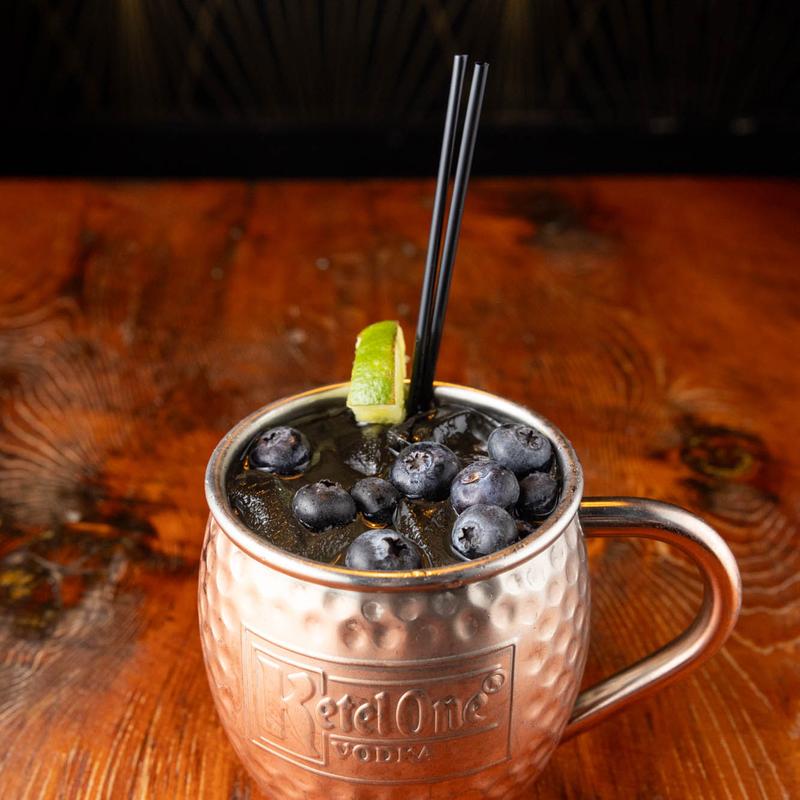 Blueberry vodka, ginger beer, and lime juice, with fresh blueberries.